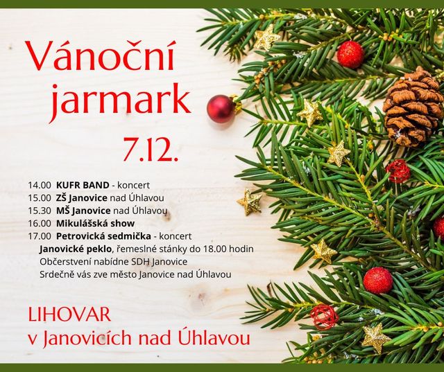 Tradiční vánoční jarmark v janovickém lihovaru: 14.00 - KUFR BAND - koncert, 15.00 - vystoupení ZŠ, 15.30 - vystoupení MŠ, 16.00 - Mikulášská show, 17.00 - Petrovická sedmička - koncert. Řemeslné stánky s vánočními dárečky. Janovické peklo po celé odpoledne. Srdečně vás zveme.